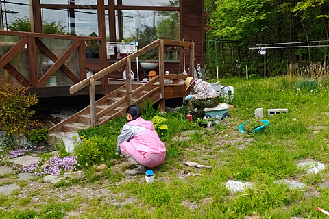 雨がぽつりぽつり…。なおみは花苗の植え付けを手伝う。
