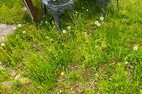 二種類の殺虫剤を撒き終えてへばっていると庭の上の方のタンポポ綿毛が目についた。なおみが春に二度、首ちょんぱして回ったあたりだ。難を逃れた背の低い花が草の中で綿毛をつけている。もう腰が立たないので15分くらいいざりながら(←言い換えのしようがない。正座しながら移動する作法も確かいざると言う。差別用語にするのはムリがある)退治した。