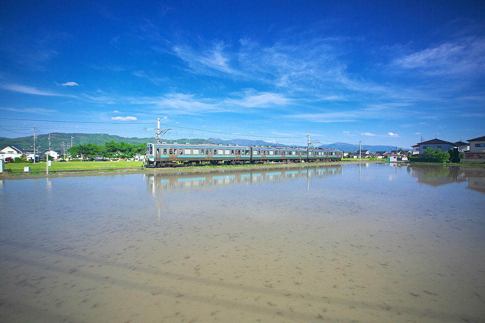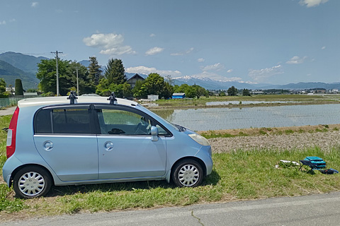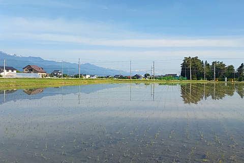 いつものようにアルプスグリーンロードを北上していると、上高地線の踏切の横にある田んぼが水鏡になっていた。今日は先を急ぎたかったのだが、手が勝手にハンドルを切った。