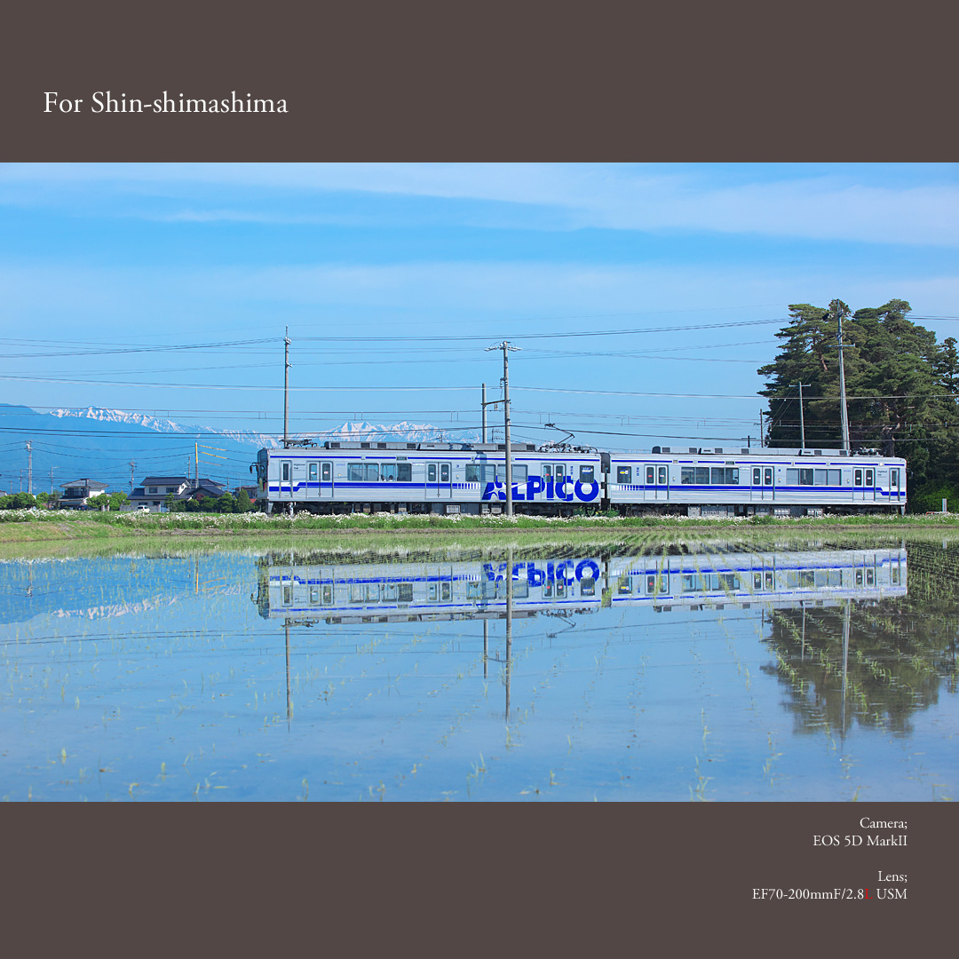少々熱中症気味となったので二枚目は諦めて穂高駅周辺にロケハンに出た。踏切で大糸線が水鏡。またまた車を寄せて次の電車を待った。特急はどうも絵にならないので、普通列車を狙うのだが、田舎はどこでも一時間に上下合わせて2本くらいしか来ない。料金も高く、駐車場も整備されていないので一般の利用客がどんどん減っている。一方で新幹線や特急を利用してビジネスや旅行をする限られた人たちへのサービスは強化されつむじ風のように途中駅を通過していく。支線はどんどん廃線に追い込んでいく。国鉄民営化とはこういうことだったわけだ。