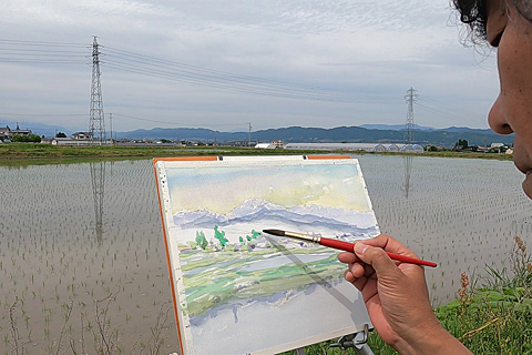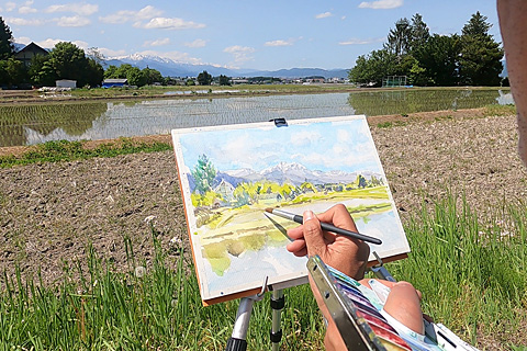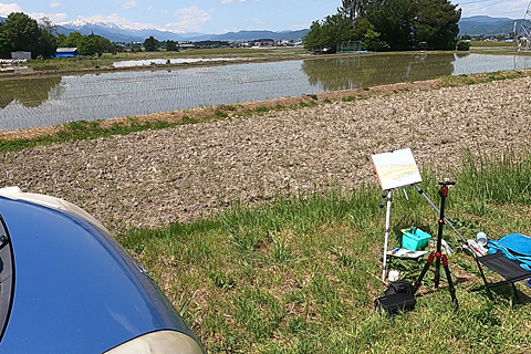 武居城から下山すると北アルプスの雲が晴れていた。いつもの場所に急ぐ途中、三郷あたりで車の停められる場所を見つけたのでここで写生することにした。