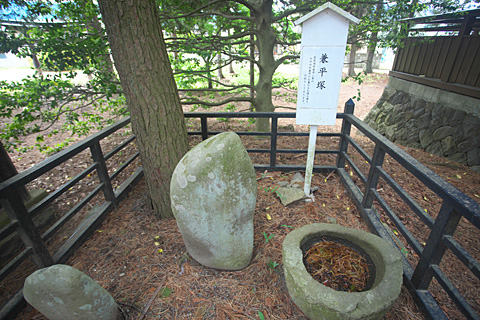 「琵琶湖畔粟津ヶ原の今井四郎兼平のお墓の土を持ち帰りお祀りしてあります。」