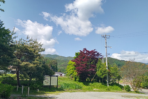 なおみが疲れ気味なので、退勤時間が遅いのを覚悟で金曜日にも送迎に出た。遠く北アルプスは雲に隠れている。安曇野まで出かけるメリットはないかもしれない。逡巡しながら朝日村あたりでロケーションを物色していると、武居城跡というところにたどり着いた。