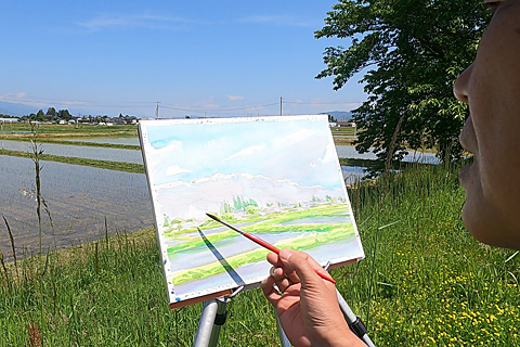 背中が熱くなってきたので撤収。安曇野から爺ヶ岳や鹿島槍を描こうとするとどうしても日を真後ろに背負うことになる。これからの季節、時間や紙の色を工夫する必要がありそうだ。残雪が消えたら「描かない」という選択肢もある。