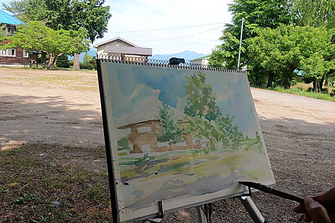 日陰から日輪舎を描くことにした。木や建物を省略して田んぼに下る道を持ってくれば絵になりそうだ。