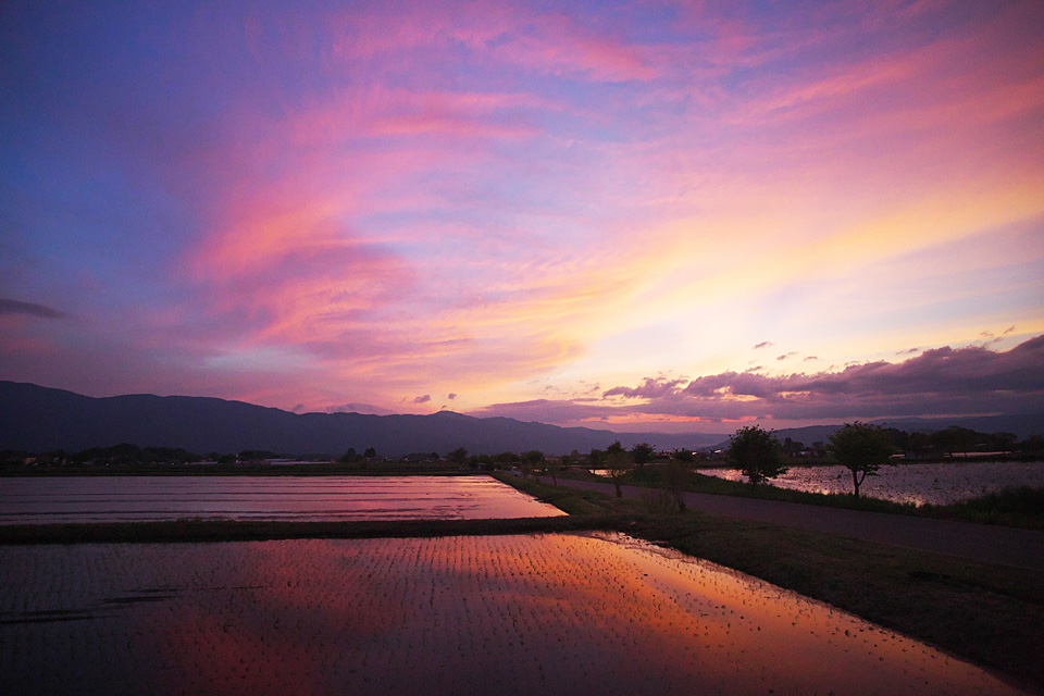あたり一面、空も山も木々も道も、ふんわり淡い茜色に染まった不思議な夕暮れ。