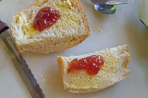 母がさかんに「いい匂いがする」と言うので、焼きたてにバターといちごジャムを載せておやつにした。このひと月、食パンを買ったことがない。