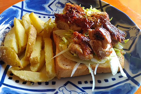 前夜解凍したモモ肉の使い切らなかった分で作ったチキンバーガー。バンズは買えないが、さすが天才が焼くとここまで旨いかという逸品。