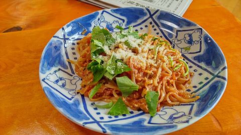 このミートソースは、前日麻婆豆腐を作った際、少々量が多かったので豆腐を投入する直前に分けておいたソースに増しトマトしてイタリアンにアレンジした。オランダでもオーストリアでもミートソースにはよく煮込んだ豆をベースに加えていた。豆板醤や甘味噌など発酵した豆ならよりコクが出るというものだ。あまりにも旨くて一人で食べるのは惜しかった。緑は庭のイタリアンパセリ。