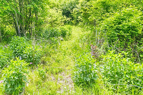 ドレミ菜園からブルーベリー園に続く小道だが今日は行かない。行って雑草があればつい取りたくなる。すでに体力の限界が近い。