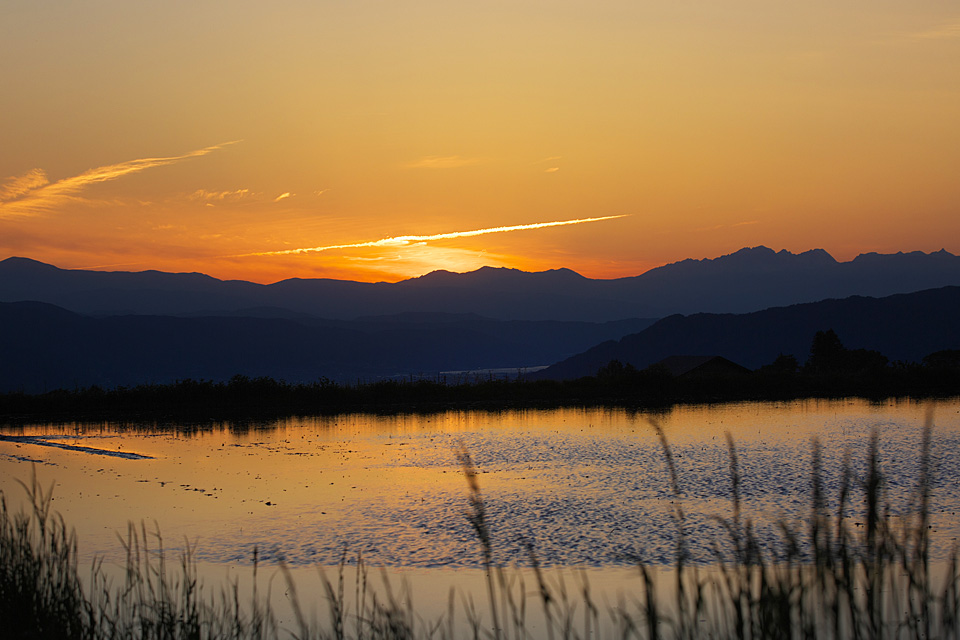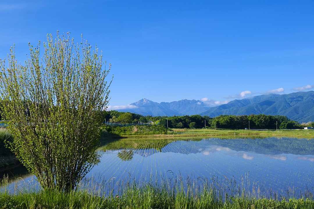 朝のウォーキング。田んぼが水鏡の季節ももうすぐ終わる。
