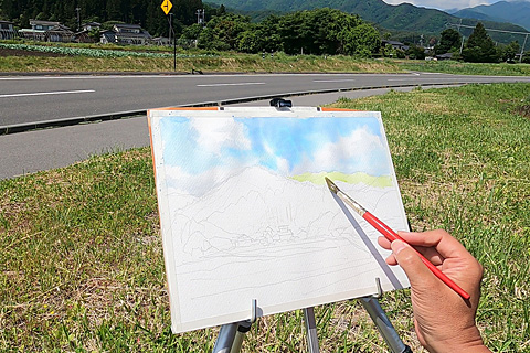 描いているのは正面の山。お椀を伏せたような見事な形をしている。