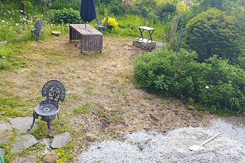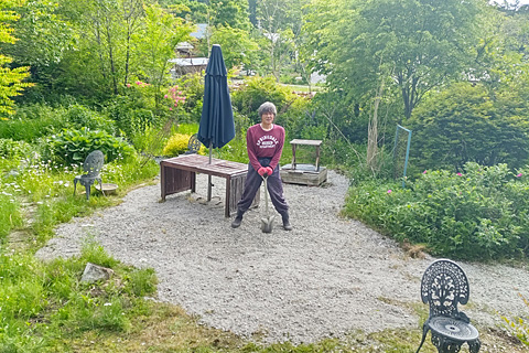 ベランダのテーブルに置いてあった石コレクションにスコップで運んできた砕石を加える。階段を上っている間に大方こぼれてしまうのだが、何回も往復するうちに山になってきて満足げ。