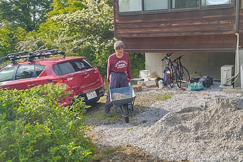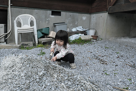 …と受け渡しがあるのでたいしてはかどらない。庭に積んである砕石に興味を示した。小さいスコップを与えると石運びに熱中する。