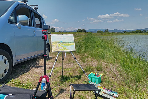 その真っ最中、激しい夕立に遭った。画材と撮影機材を車に運ぶ間にずぶ濡れ。