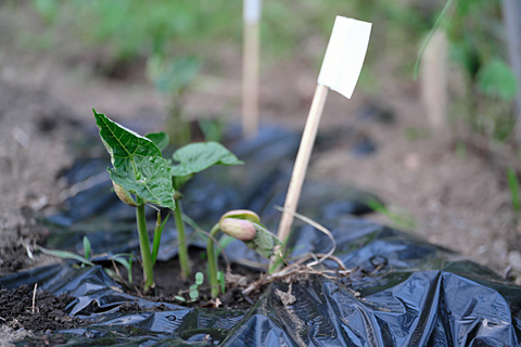モロッコインゲンは発芽した。これを間引くというのはなかなか心情的につらいものがある。…雑草はビシバシ抜くのに矛盾している。