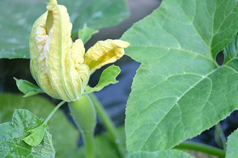 ズッキーニ。なんともう花がしおれているが、雄花が見当たらない。両性花ではないので受粉してなければ実はならない。