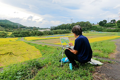 なおみを送ってから朝日村まで行ってみたがほとんどが野菜畑である。今日は稲田を描きたかったので洗馬に戻って写生した。