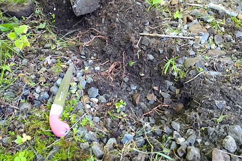 砂利の中を木の枝が横切っている。伐らなければ穴が掘れない。