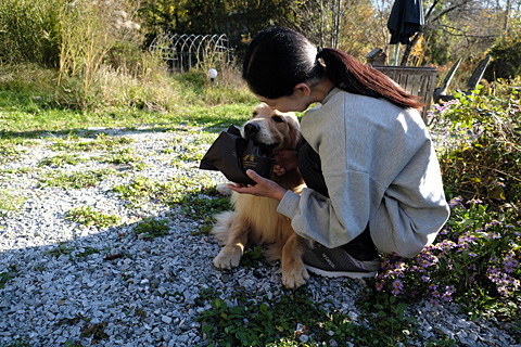森の道で4才のラブに会った。なんと富士ハーネスのキャリアチェンジ犬だった。