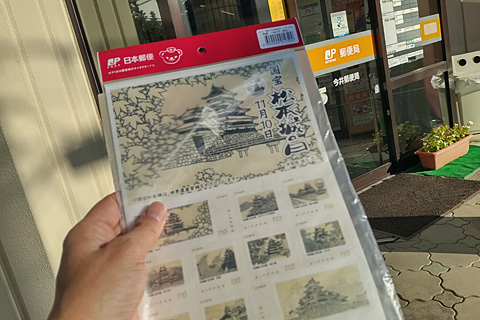 今井の郵便局で予約しておいた「松本城の日」記念切手シートを購入。