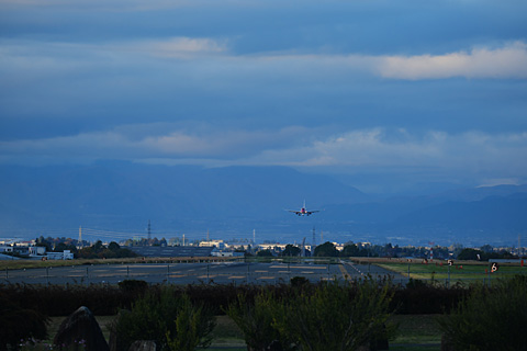 出発便が北風運用らしいので、到着便を狙って滑走路の南側に陣取っていた。…北から下りてきた。望遠ない。なぜだー!!(;^_^A