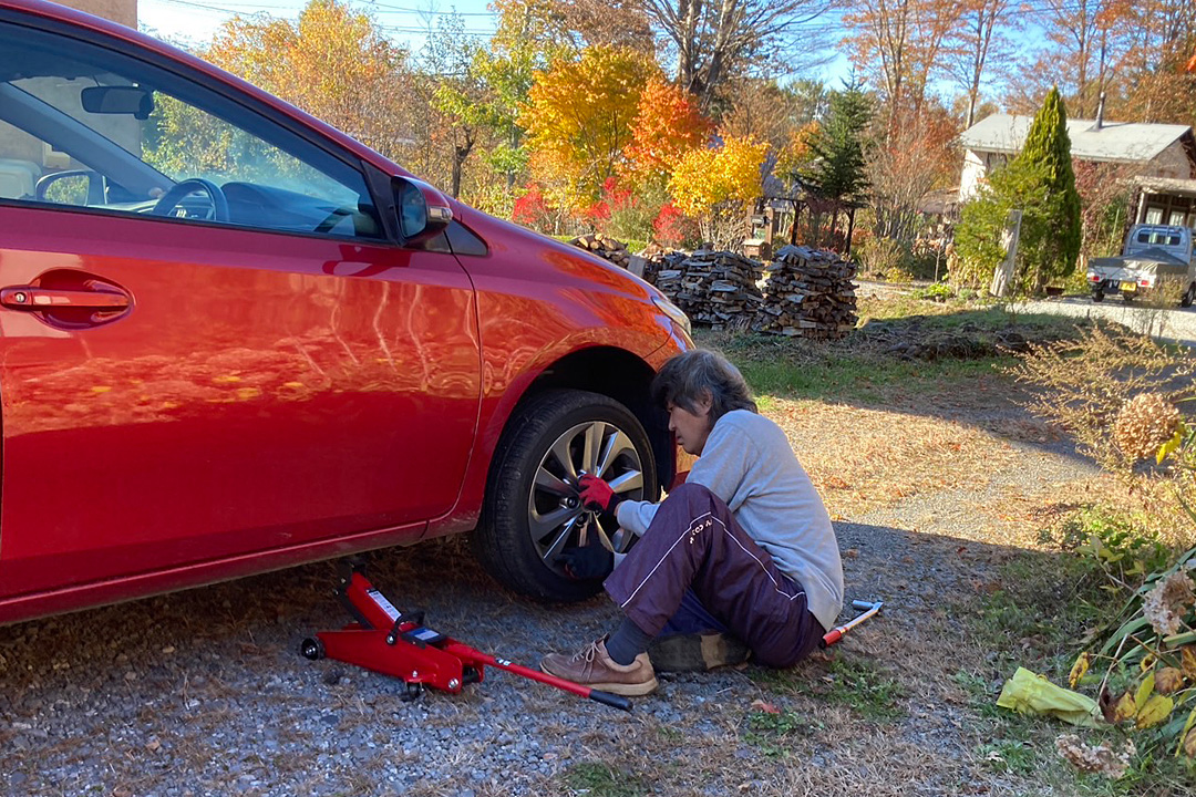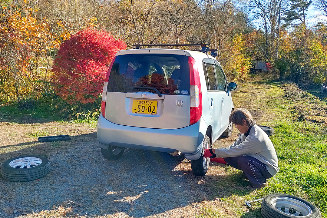 帰宅してミズイロ☆ライフのタイヤ交換をした。こちらはホンモノのブリザック3年目。タイヤが軽いのでラクラク。