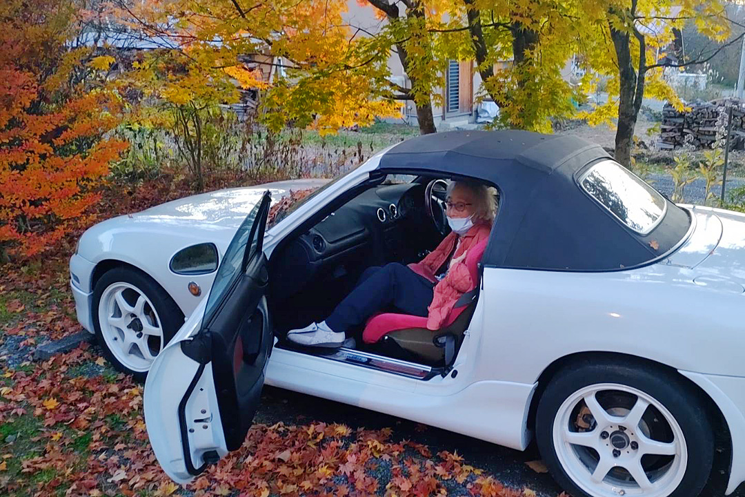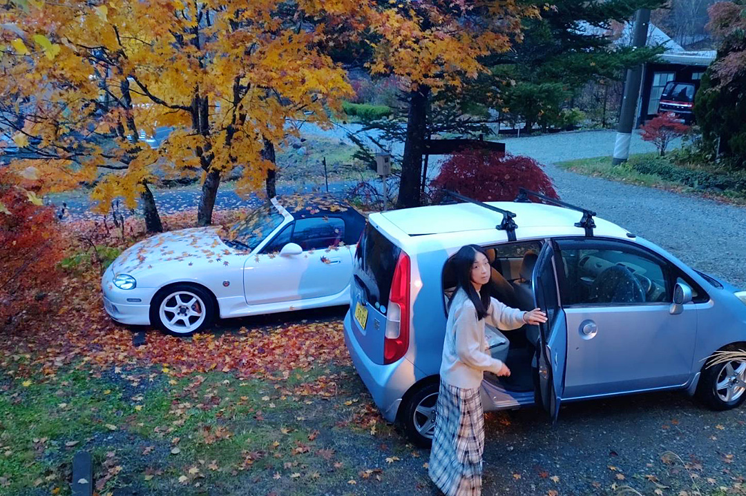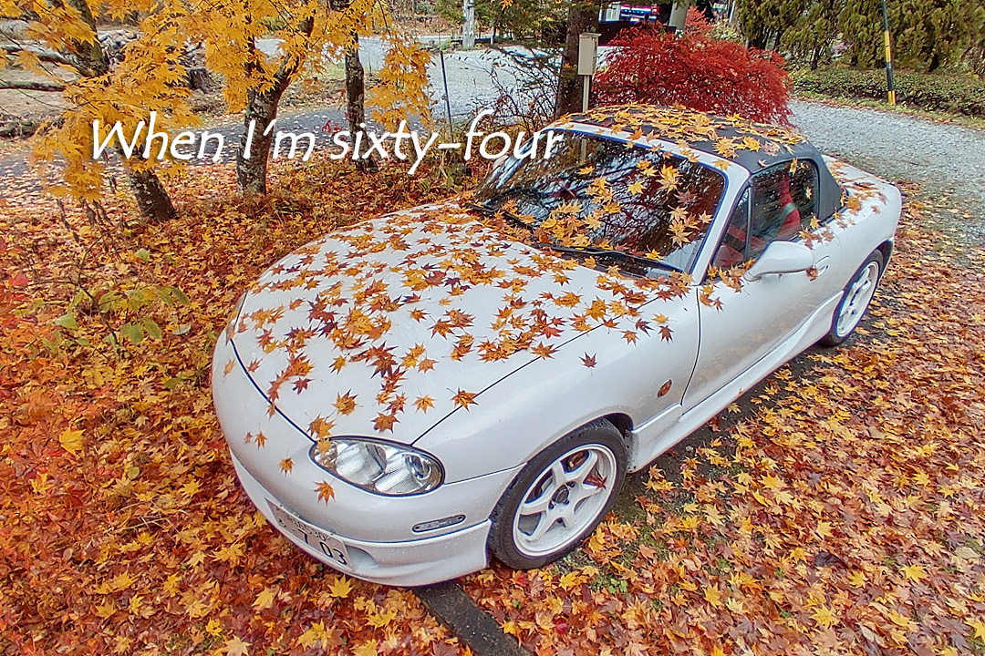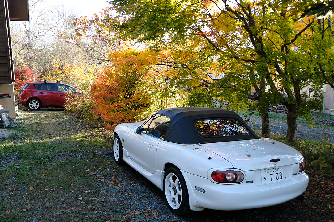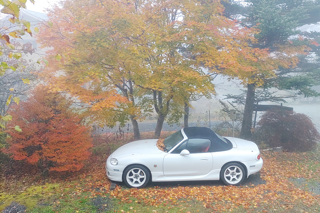 郵便局へ行こうと外に出るとボクのNBが秋色にペイントされていた。風と楓と雨のヤツらが相談してボクに粋な誕プレをくれたらしい。模様が取れないように村までそっと走ったよ。
