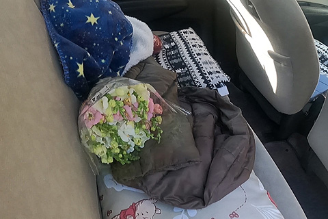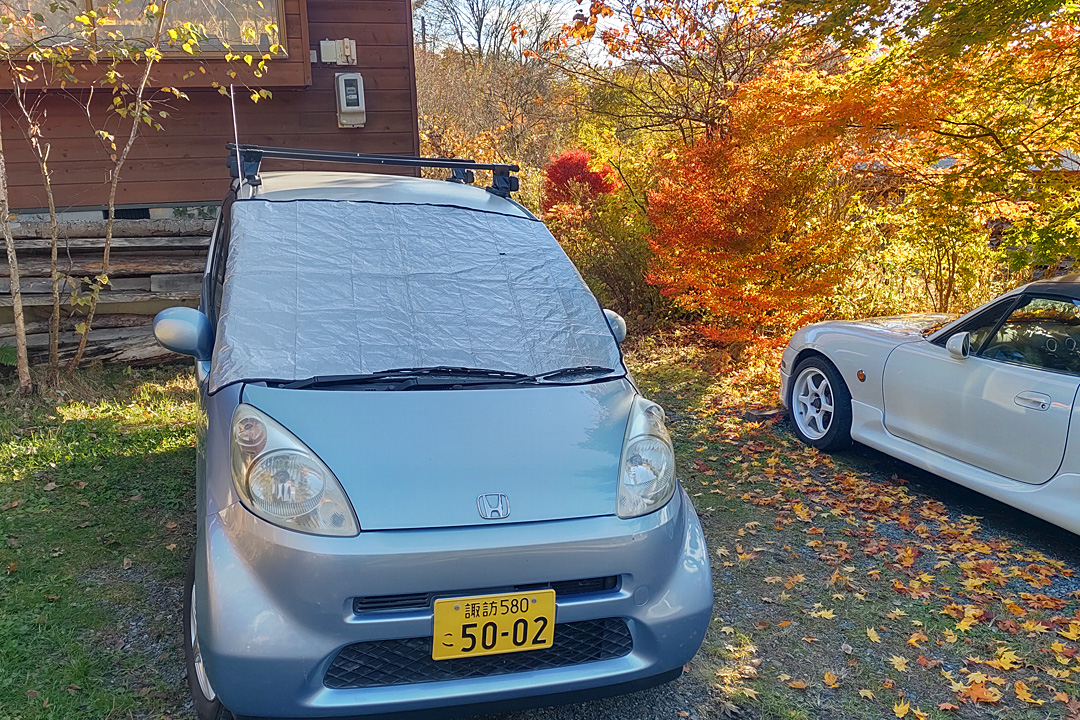 なおみの出勤に備えてフロントガラスにシートを被せた。
