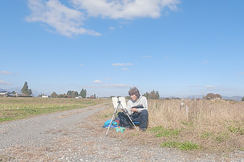 予報に反して日が出てきたのは11時頃、日輪舎の下に移動して写生開始。