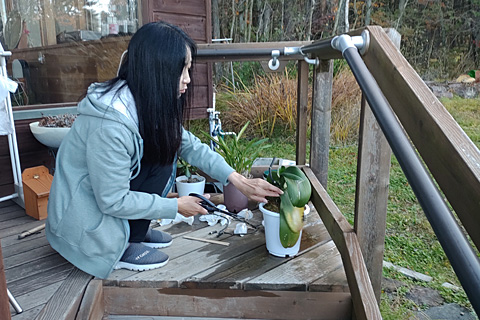 今年、まさかの胡蝶蘭を咲かせたなおみが来年に向けて手入れをしている。