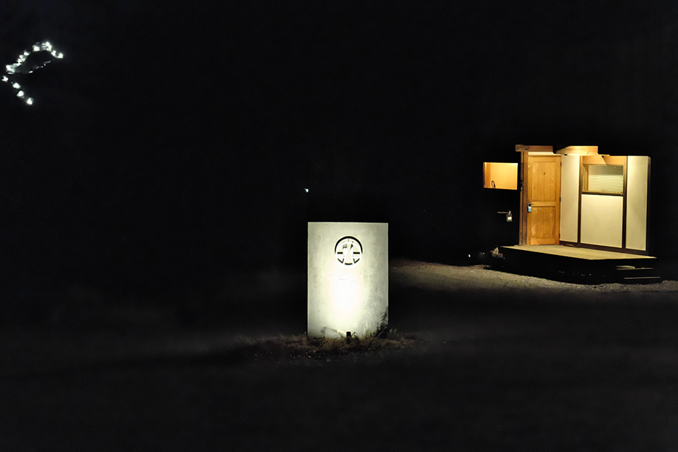 遥かに勝浦温泉の街明かり。低い光跡は羽田を発着する飛行機だろう。