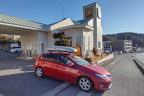 勝浦の旅籠屋に宿泊。アメリカでよく泊まるモーテルはこんな感じだと話すと、パンさんたちもやたら楽しんでくれた。