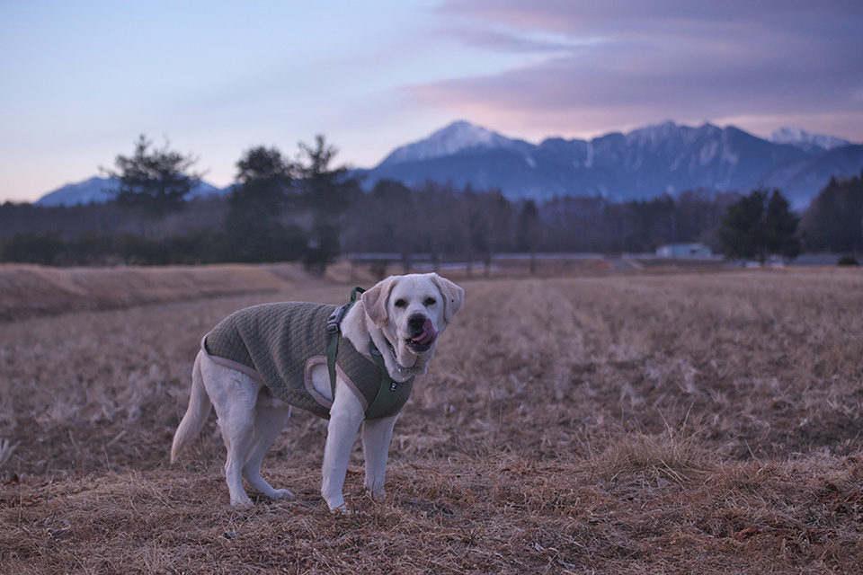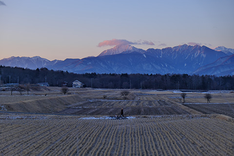 甲斐駒の雪が朱鷺色にほんのりと染まって得も言われぬ美しさです。気温-5℃、朝散歩の時間もすっかり明るくなりました。