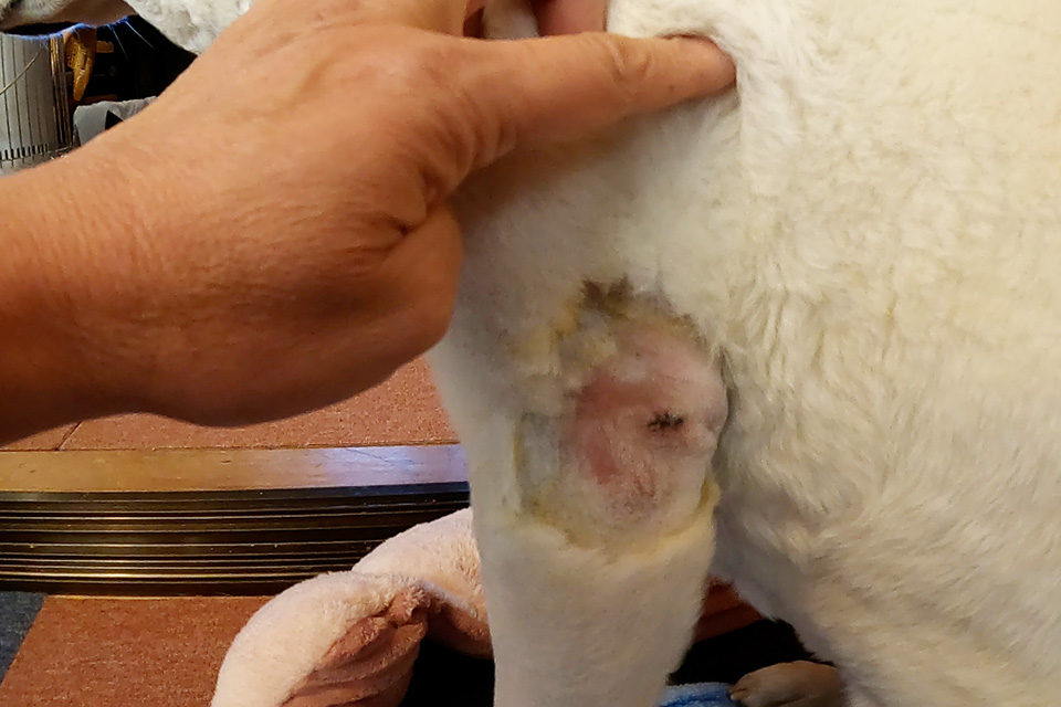 傷口はきれいに縫合されている。抜糸は2週間後。