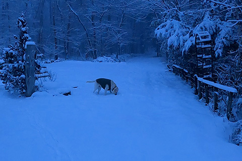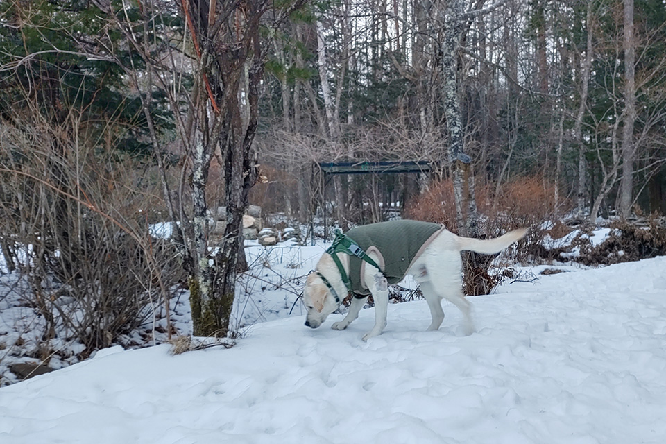 雪かきしてる間にローリィは庭に行ったようだ。足跡をたどればすぐに行き先がわかる。
