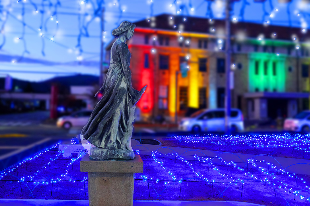 Camra: FUJIFILM X-S10 + Lenz: XF18-55mmF2.8-4 R LM OIS 原村出身の彫刻家清水多嘉示の作品 背景は旧岡谷市役所庁舎 December 1st, 2024 長野県岡谷市