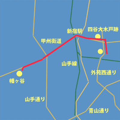北進して甲州街道との交差点に大木戸門跡がある。1616(元和2)年に幕府によって設けられた。江戸と呼べるのはここより東,代々幡村にある我が家はもちろん現在の新宿駅も江戸府外ということになる。