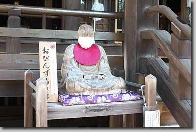 おびんずるさん(インドの僧侶賓頭廬尊者像)もマスクをお召しになっている。