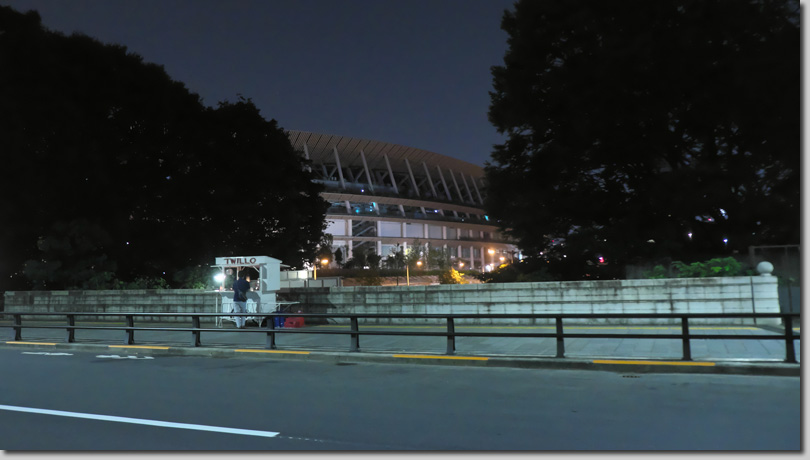 霞ヶ丘の競技場が見えてきた。予定通りオリンピックが開催されていれば,今夜は夜遅くまで陸上競技の決勝が目白押し。今頃はカクテル光線の中でアスリートが躍動しスタジアムは満員の観客であふれていたことだろう。