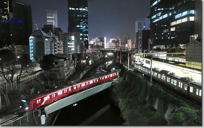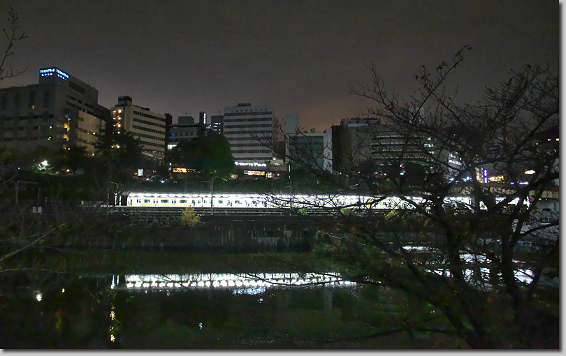 外堀の中を走る電車を撮ろうと一眼を担いでチャレンジ。この夜は早稲田通りの牛込橋からスタート。