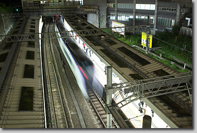 カメラをしまおうとしているところに高速で特急列車が通過した。あわてて撮影したが設定が間に合わなかった。22時45分東京駅発のかいじ59号と思われる。