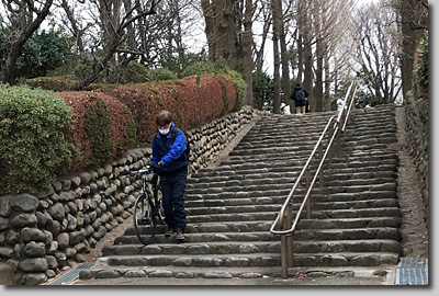 シーズンに備えて園内の坂にはゴザが敷かれて一方通行の標識が立てられている。昨春の緊急事態宣言中は花見の名所がみな閉鎖された。果たして今年はどうなるのだろう。人びとの様子にはあまり緊張感がない。