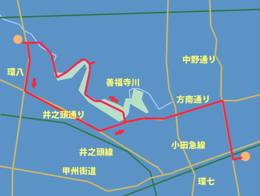 グーグルマップの自転車ナビが日本でも機能するようになった。それはつい最近のことである。去年の暮れにはまだ使えなかった。そのグーグルマップは井之頭通りを推奨したが,ボクは方南通りを選んだ。途中から善福寺川に沿って和田堀公園を通ってみようという作戦である。