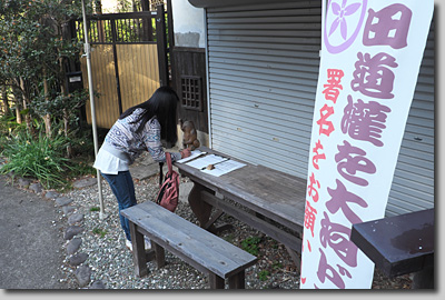 「太田道灌を大河ドラマに」という署名にペンを執る。名簿の前を見ると中部,関西方面からはるばるお越しの方もたくさんいらっしゃる。九州や北海道の住所もある。道灌は人気者なのである。