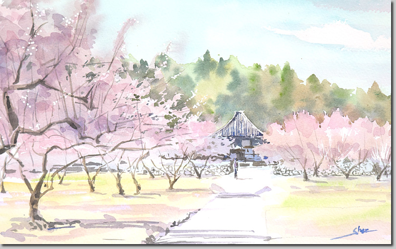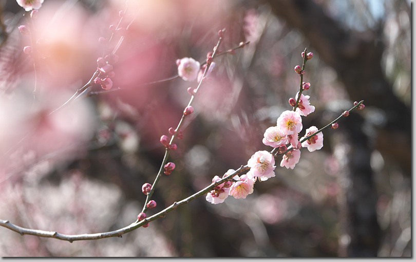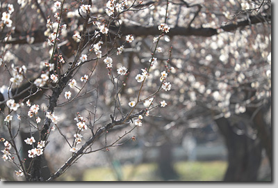 というわけで予定外の梅園見学。梅はまだ8分咲き程度だったがそれでも花で煙るようだ。訪れる車が増え始め道路には車列が出来始めていた。園内には三脚を担いだ好事家の姿もある。