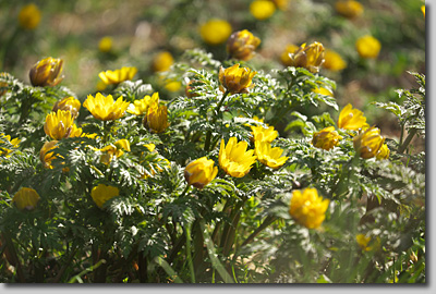 梅の下に丁寧に植えられているフクジュソウに朝日が美しい。車まで5DやLレンズを取りに戻るのも面倒なので,ミラーレスに望遠をつけてしゃがみ込んだ。