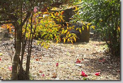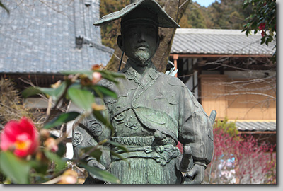 銅像の脇でツバキの枝が揺れるのでよく見ると葉陰からメジロが覗いた。道灌公の家来のつもりなのだろうか。主人を守るように逃げない。