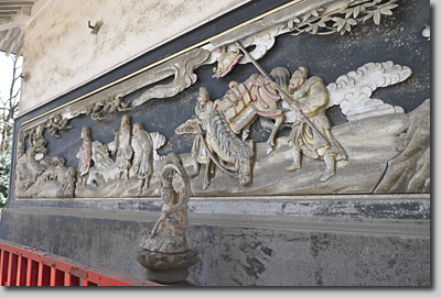 少し遠回りして経蔵を見物した。漆喰壁に道元一行らしき僧を彫った彫刻が目を引く。経蔵内部は一般公開されていない。