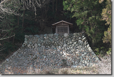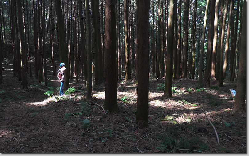 そんな足色でもどうにかこうにか10分あまり。森の中に広大な平坦地があった。現在は杉や落葉松が植林されているが元は切り開かれた造成地であったろう。太田道真が築いた山枝庵砦跡である。